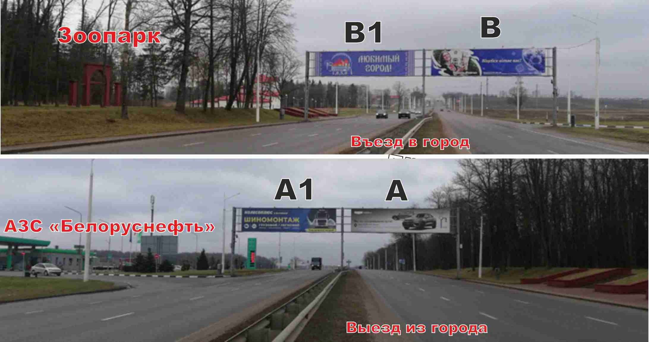 Трехопорная двусторонняя рекламная арочная конструкция по Московскому проспекту (возле автозаправки "Белоруснефть") с рекламным полем 12*3 метра на въезде в г. Витебск страссы М1 и Е95 на Московский проспект около АЗС "Беларуснефть" и зоопарка.