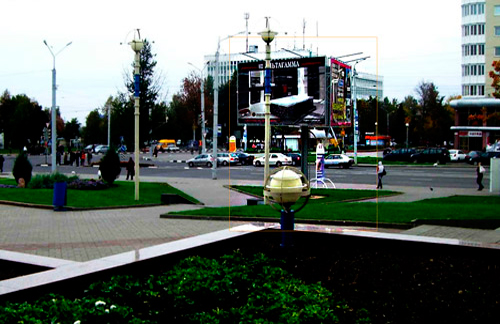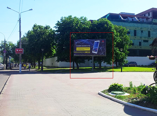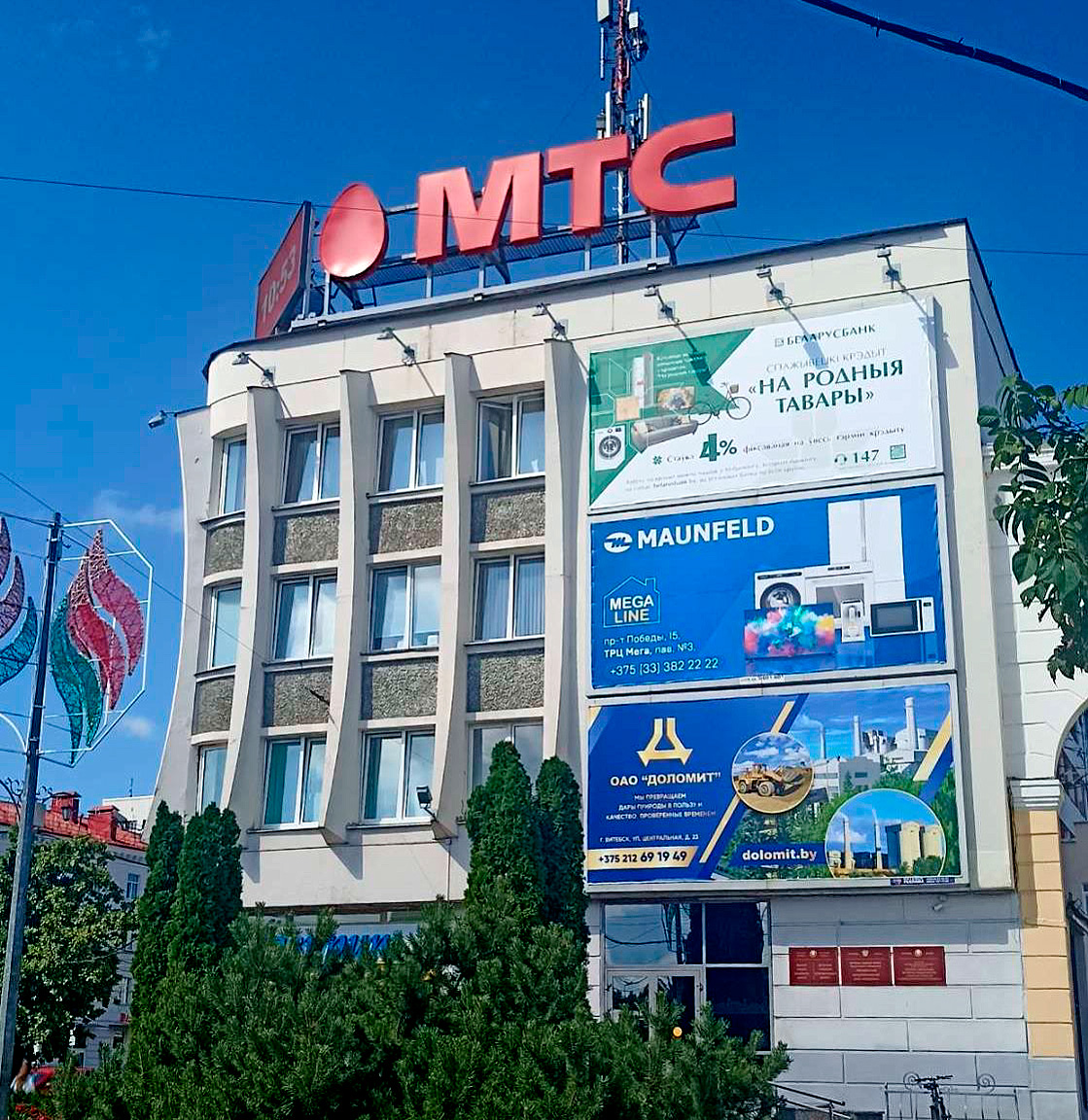 на здании горисполкома (пересечение с ул. Ленина, площадь Свободы, рядом универмаг, ТЦ «Маркосити», летний амфитеатр (Славянский Базар)) Рекламное поле 3*6 метров