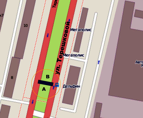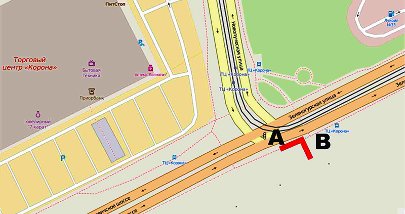 Перекресток около ТЦ «Грин», центр спального микрорайона ЮГ. Через перекресток проходят множество маршрутов автобусов, троллейбусов и маршрутных такси.